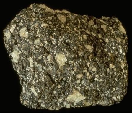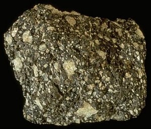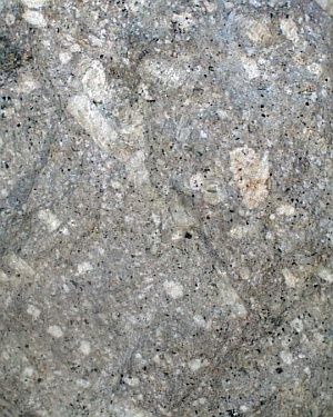 bestaat uit een grijsachtige korrelige massa met ingesloten, eerder gevormde