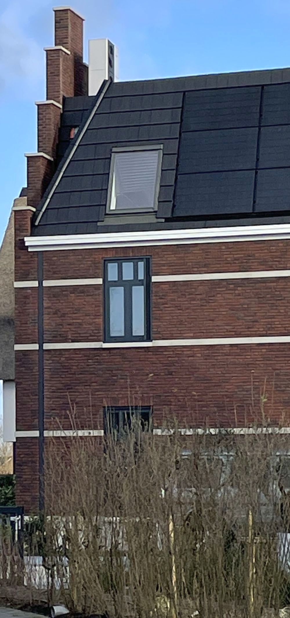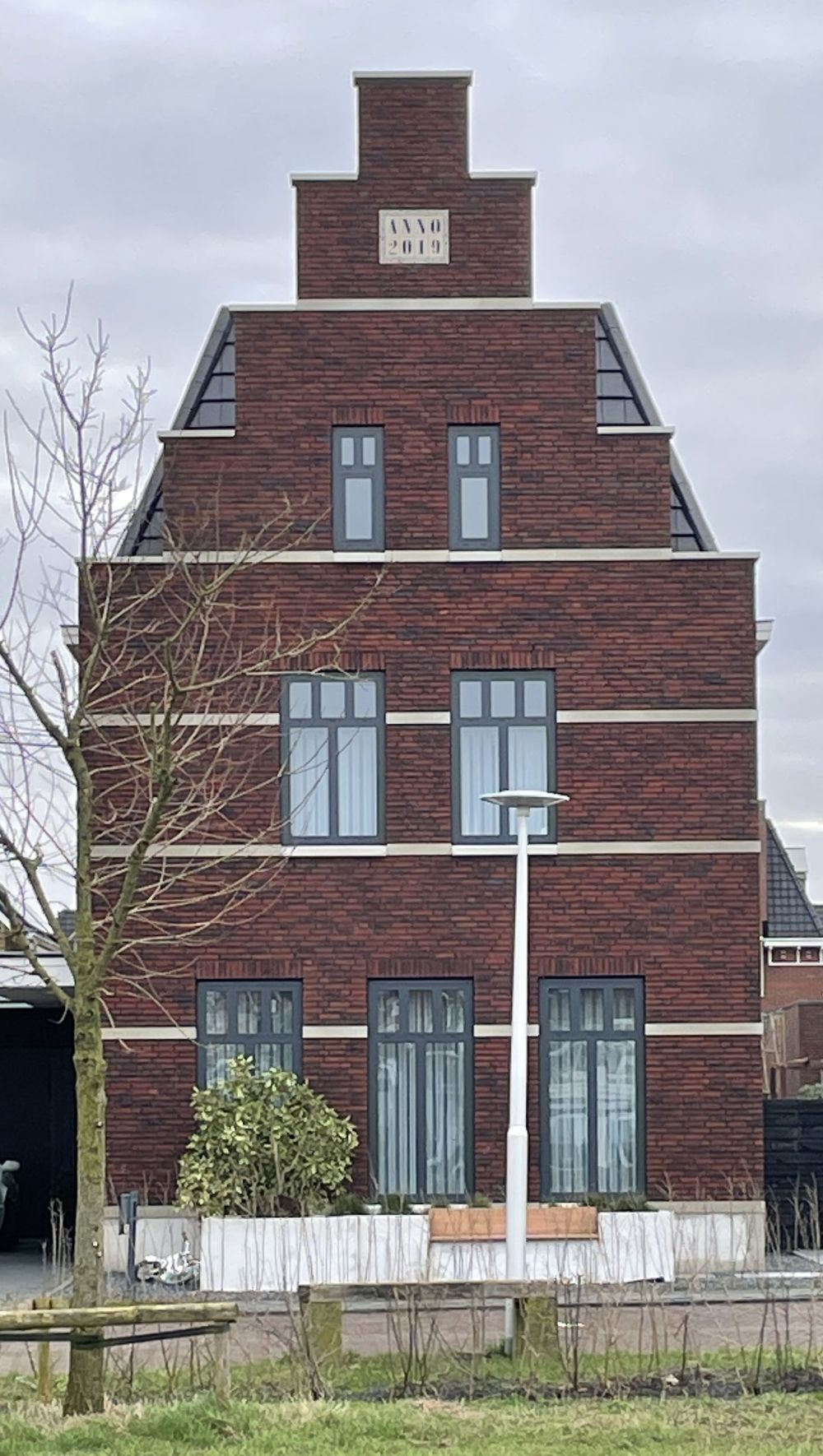 - het dakvlak is recht vóór het huis staand niet te zien (geldt voor meer geveltypen).