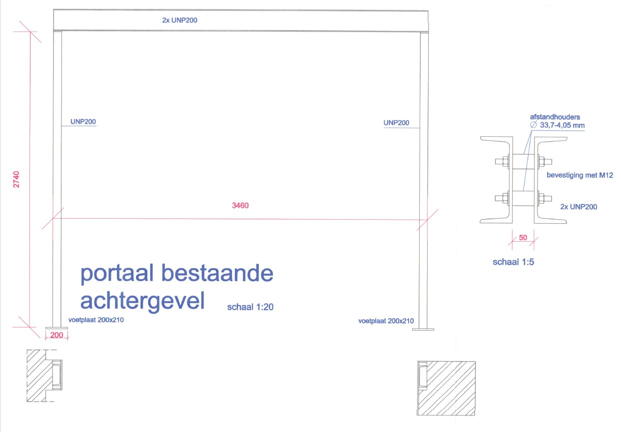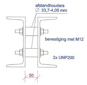 twee unp-profielen, gekoppeld met afstandhouders waardoor een soort fors i-profiel ontstaat, om een breder draagvlak te scheppen van 200 mm, om een oude muur erboven te dragen (niet altijd zijn de afstandhouders aanwezig, afhankelijk van wat gewenst is, zie bij puibalk); klik voor het portaal waar dit de bovenbalk is: ![]() |
