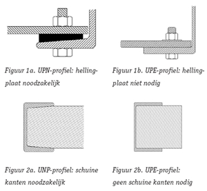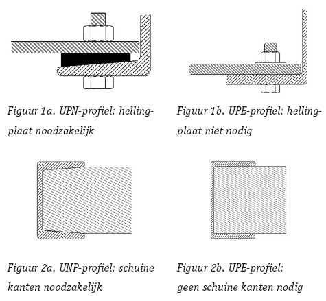 verschillen upe-balk en unp-balk/upn-balk, waardoor de upe gunstiger kan zijn (geen hellingplaat nodig en geen afschuining van de kanten bij invallende balk); klik voor groter (mcb): ![]() |