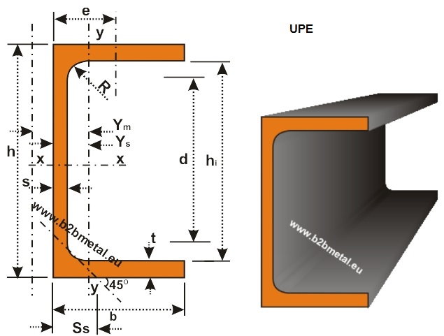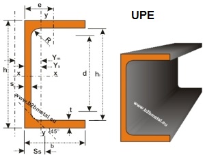 - de UPE-balk heeft rechte flenzen die overal even dik zijn en dikker zijn dan het lijf; het draagvermogen van de UPE-balk verschilt niet veel van de UPN-balk/UNP-balk ("de weerstandsmomenten van de UPE-profielen zijn over de sterke as, de x-as, gelijk aan die van de UPN-profielen en over de y-as, de zwakke as, zelfs hoger dan die van de UPN-profielen")