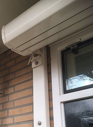 zonnescherm trekt als het uitgerold is fors aan de bovenzijde van de baksteen muur van een uitbouw; een kracht uit het vlak, dus de bevestiging moet extra stevig en daarmee extra lang zijn (foto joostdevree): ![]() |