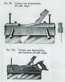 3. Een varken is een schaaf om groeven te maken. Eerst wordt de groef met een veerploeg met breedte en diepte-instelling voorgeschaafd waarna deze met het varken (alleen diepte-instelling) verder wordt uitgeschaafd.