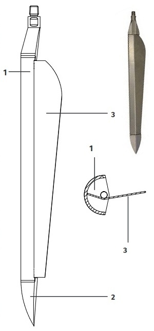 onderstuk van de veenboor, speciaal voor het wat slappere veen; rechts een voorbeeld (royal eijkelkamp): 1 = bemonsteringsgedeelte 2 = massieve punt 3 = scharnierend deel ![]() |