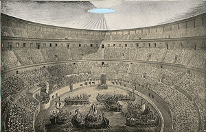 door de openingen tussen de delen van het velum kan toch zonlicht vallen, zoals hier door lichte strepen is uitgebeeld op het schilderij pollice verso van jean-léon gérome uit 1872 (de "duim naar beneden" van de vestaalse maagden op de tribue rechts betekende: de gladiator heeft goed gestreden en wordt gespaard; een "duim omhoog" betekende juist dood aan de gladiator; dus duidelijk een andere betekenis van "duim omlaag" en "duim omhoog" dan we tegenwoordig kennen): klik voor de bron! ![]() |