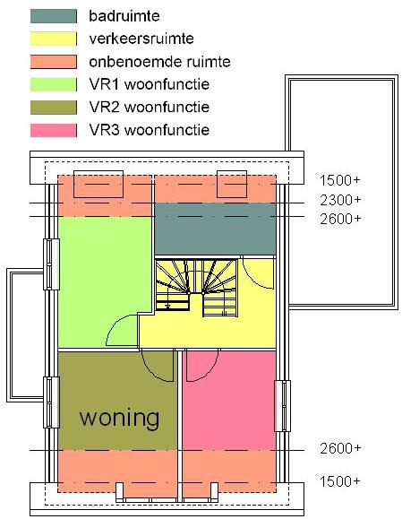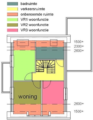 - In de gekleurde tekening verderop vormen de ruimten VR1, 2, en 3 samen het verblijfsgebied.