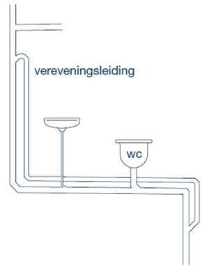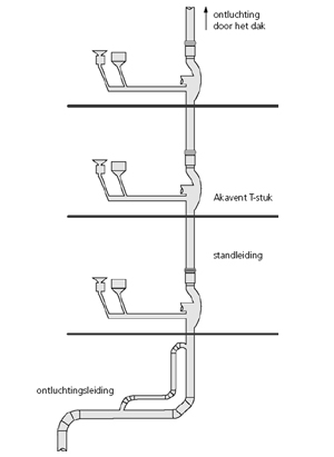 bij het verslepen van de standleiding (onderaan de tekening, ontluchtingsleiding) is een vereveningsleiding noodzakelijk; de t-stukken tussen normale afvoerleiding en standleiding zijn speciale t-stukken om een betere afvoer te realiseren (akavent van akatherm): ![]() |