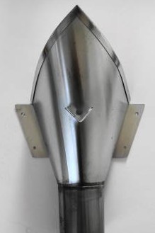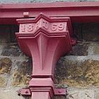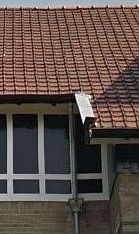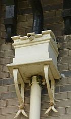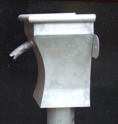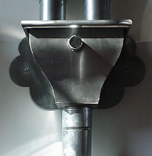 met spuwertje (overloop), gekrulde bovenrand en zwart gelakte aanvoerpijp (zelfde kleur als de consoles van de dakgoot): |