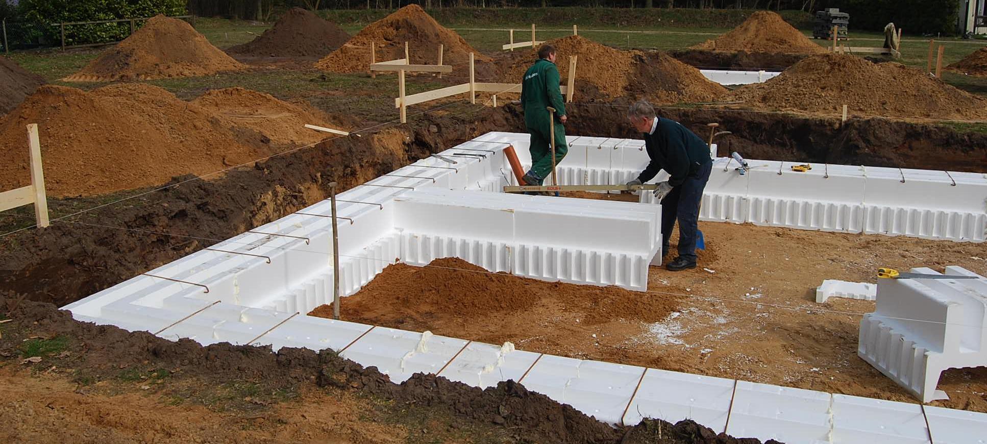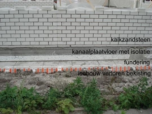 Laane fundering, polystyreen verloren bekisting (XPS) bestaat uit losse delen en is geschikt als plaatfundering (klik voor groter):