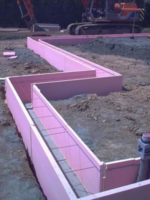 Het betreft hierbij geen fundering, maar een dubbele wand van Neopor (grafiet-polystyreen) waarbij de spouw gevuld wordt met wapening en beton. Hierdoor is een zeer goede isolatie mogelijk. Let er wel op dat aan de polystyreen-wand wat moeilijker zaken te bevestigen zijn; in het beton onde de aan de binnenzijde dunnere polystyreenwand is uiteraard een goede bevestiging mogelijk. (Brochure)