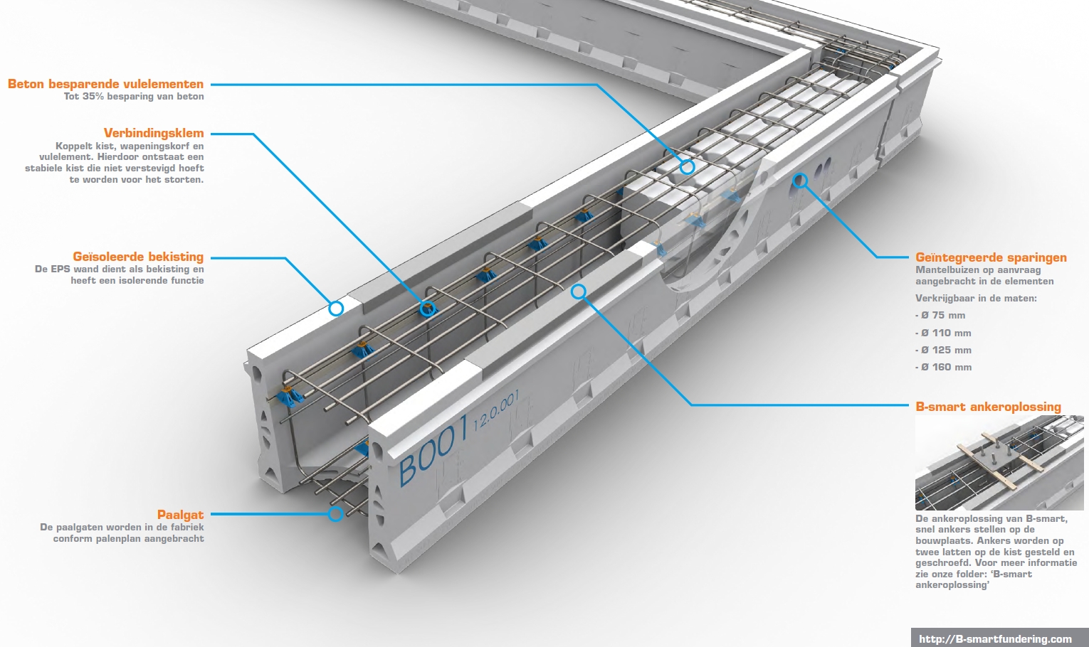 B-Smart levert verloren bekistingen van EPS voor zowel paalfunderingen als funderingen op staal. Ook de paalgaten en mantelbuizen (voor de leidingen) kunnen bij B-Smart vooraf worden aangebracht, zodat de bekisting na plaatsen niet meer doorboord hoeft te worden (achteraf de bekisting doorboren is altijd een risico, verkeerde plaats, kieren e.d.).