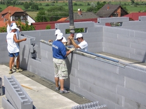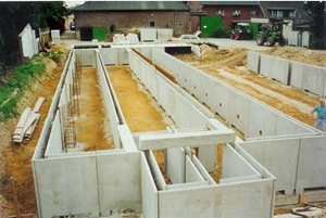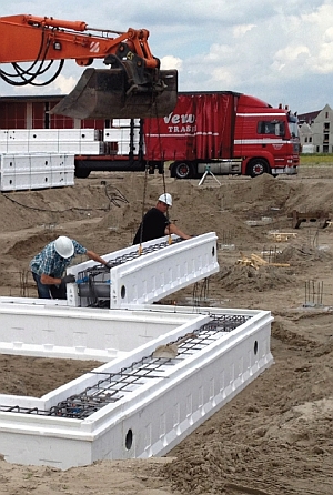 "Bij dit systeem wordt de zogenaamde "mantelbetonbouwwijze" eenvoudig en geniaal omgekeerd. In plaats van een omslachtige bekisting en ontkisting met isolering van de afgewerkte muren daarna, zijn onze Neopor-elementen bekisting en isolatie tegelijk. En deze elementen worden heel eenvoudig als "legostenen" op elkaar gezet, ze zijn van noppen en gleuven voorzien die in elkaar sluiten en vervolgens met vulbeton uitgegoten worden."