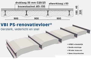 I-liggers van gevouwen en geklonken verduurzaamd staal (i.p.v. betonnen balken) met polystyreen vulblokken met koolstof (ook als renovatievloer, licht in gewicht; afbeelding VBI):