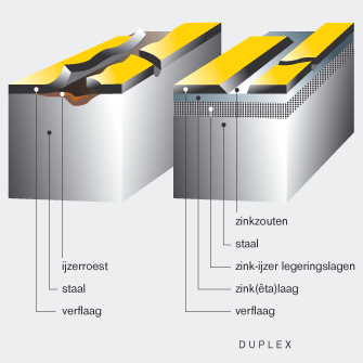 Het Duplex-systeem (afbeelding onder) is de combinatie van thermisch verzinken met poedercoaten. Het is de meest duurzame bescherming die mogelijk is om corrosie te voorkomen. Bovendien krijgt het metaal een mooie uitstraling door in elke gewenste kleur te coaten. Het resultaat van het Duplex-systeem is een uitzonderlijk lange levensduur van het metaal. Langer nog dan de beschermingsduur van verzinken en poedercoaten afzonderlijk.