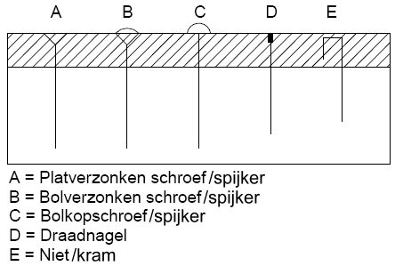 voorbeelden van nagels/schroeven: platverzonken, bolverzonken (heet zo, maar is niet echt verzonken), bolkop, draadnagel en niet/kram; klik voor groter:![]() |
