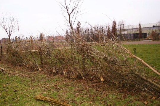 - Na een aantal jaren worden deze een paar decimeter vanaf de grond half doorgezaagd en het bovenste deel wordt schuin gezet. De in de breedte groeiende takken worden vervlochten met die in de lengterichting van de