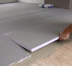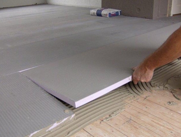 | bouwplaten met isolatiemateriaal worden gelijmd op een houten vloer; daarna worden de platen gefreesd om de verwarmingsbuizen (vloerverwarming nederland)  |