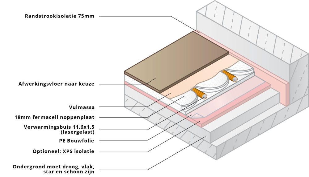 - elke diameter verwarmingsbuis is mogelijk, afhankelijk van de maximale opbouwhoogte van vloer en nieuwe dekvloer en vloerbedekking van de gebruiker.