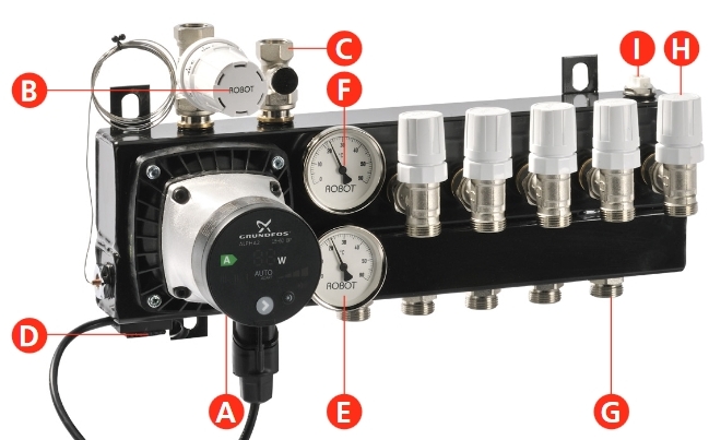 | compacte verdeler met uitleg onderdelen; hier is geen verschil in kleur zichtbaar tussen aanvoer en retour, maar vaak is de ondergroep rood (aanvoer, warm) en de bovengroep blauw (retour, koud); klik voor groter (vloerverwarmingnederland):  | ||||||||||
