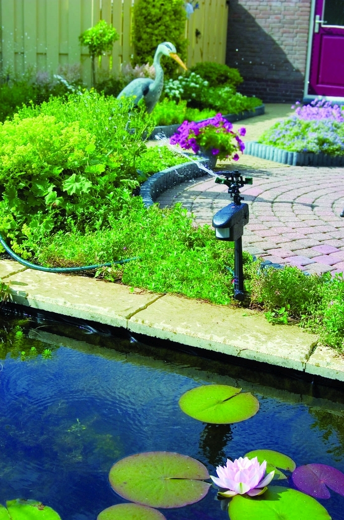 - Reigers en andere dieren worden verjaagd door een waterstraal na detectie van het dier door een bewegingsmelder; ook het eigen huisdier wordt gedetecteerd en verjaagd.