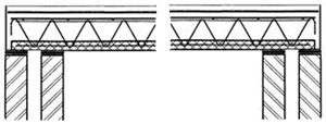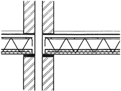 niet geheel vrije oplegging (deels ingeklemd) van een betonvloer; deze vorm van oplegging vermijdt geluidoverlast door contactgeluid: ![]() |