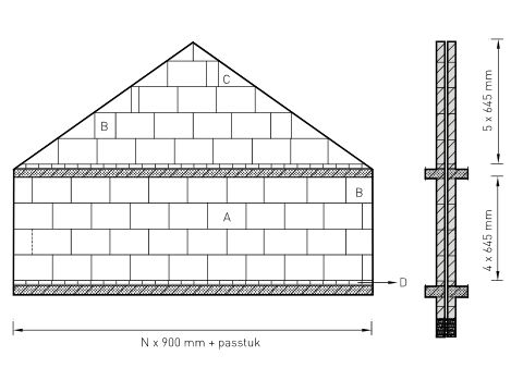eenvoudige wanduitslag met A standaard formaat, B rechte passtuk, C schuin passtuk en D kimblok; klik voor iets groter (xella): ![]() |