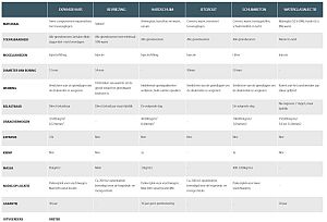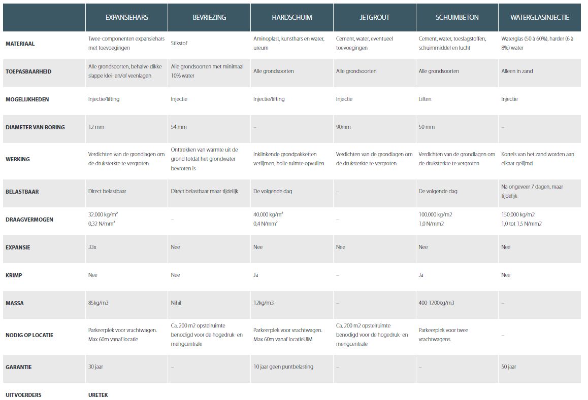 Onderstaand een uitgebreide tabel met een vergelijking van de injectietechnieken expansiehars, bevriezing, hardschuim, jetgrout, schuimbeton,