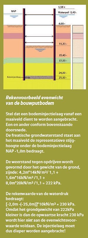 evenwichtstoestand met berekening, een voorbeeld waaruit blijkt dat de injectielaag iets dieper moet (prof.dr.ir.a.e.c. van der stoel, crux engineering, uit geotechniek okt 2013): ![]() |