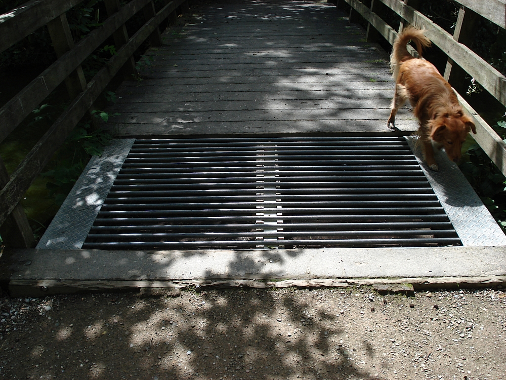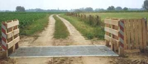 veerooster met geleiding, een extra stevig veerooster zodat ook zwaar (landbouw)verkeer er over kan rijden; klik voor groter (sfs-afrastering): ![]() |