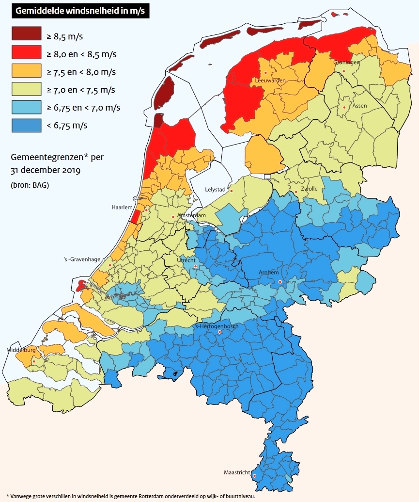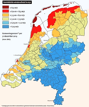 windsnelheden op land zijn over het algemeen aanzienlijk lager dan windsnelheden op zee en aan zee, zeker voor kleine lage particuliere windmolentjes; klik voor groter! (rvo, bag, knmi, cbs): ![]() |