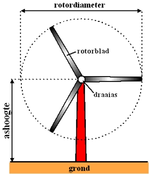 een paar kenmerken van een windmolen; rotordiameter, rotorblad (wiek), draaias, ashoogte, mast:![]() |