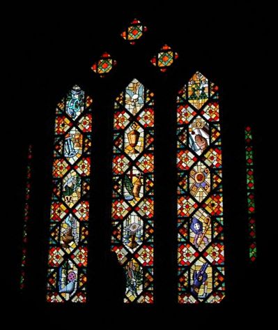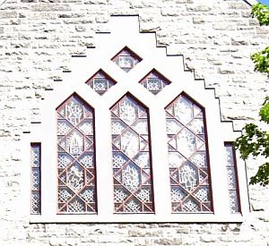 windroedes met een houtachtig uiterlijk en in een architectonisch interessante uitvoering bij een dalle de verre glaskunstwerk; klik voor een grotere opname voor het zicht vanuit binnen (institute for stained glass in canada): ![]() |