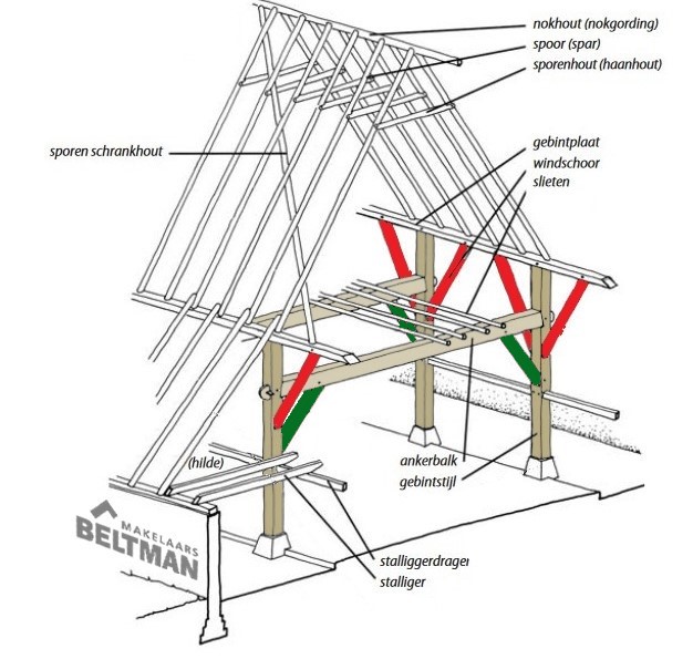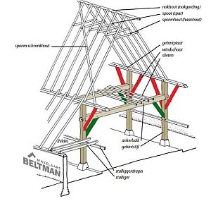 "Ook: jaagband, jachtband. Schuin oplopend onderdeel in de lengterichting van een kap tussen gebintstijl en fliering of gording.
