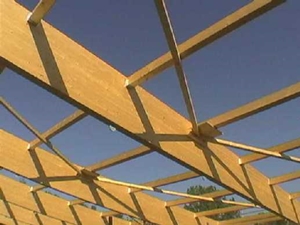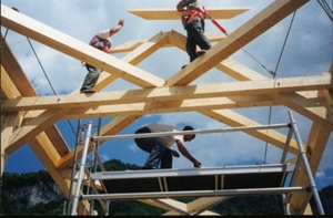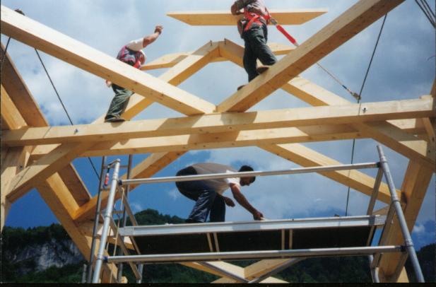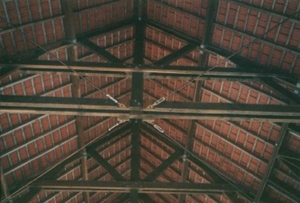 Windverband in de vorm van stalen draden in een overigens "natuurlijk" dak van hout en platte dakpannen in de vorm van leistenen. Overkapping van een benzinestation in Frankrijk.