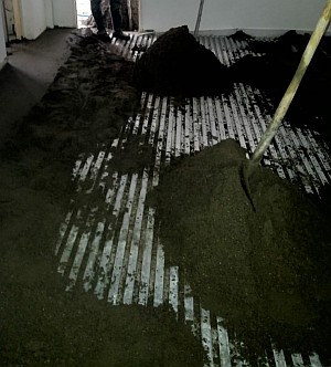 strijken van een zandcementvloer (links al een gedeelte uitgevoerd), hier op een ondergrond van zwaluwstaartplaten, waarschijnlijk over draagbalken; een zandcementvloer op zwaluwstaartplaten kan uitsluitend als de platen goed vastgelegd worden en vast en stabiel blijven liggen omdat anders de zandcementvloer kan bewegen en scheuren kan gaan vertonen (woodstock vloeren, zandcement): ![]() |