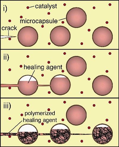 zelfherstellend materiaal, gebroken korrel brengt herstellend materiaal in de materie (afbeelding university of illinois): ![]() |