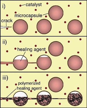 de methode van een zelfherstellend composiet waar microcapsules met een herstellende stof aan is toegevoegd, die bij een beschadiging vrijkomt (afbeelding university of illinois): ![]() |
