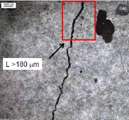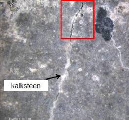 (b) bacteriën zetten met behulp van water en zuurstof kalk af in de dunnere scheuren (< 180 mu): ![]() |