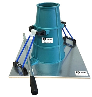 zetmaat; de newa slump testset bestaat uit: - kunststof kegel van abrams voorzien van handvatten welke kan worden vastgezet aan de bodemplaat - kunststof vultrechter voor de kegel van abrams - porstaaf - bodemplaat voorzien van handvatten ![]() |