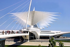 deze zonwering van het milwaukee art museum van arch. calatrava kan open en dichtgezet worden (de foto toont een aantal stadia; foto milwaukee art museum):![]() |
