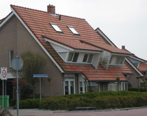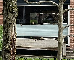 zonwering buiten, drie methoden (rolgordijn buiten, uitvalscherm, leibomen) (en zonwering binnen, rolgordijn kleine kamer boven, links): ![]() |